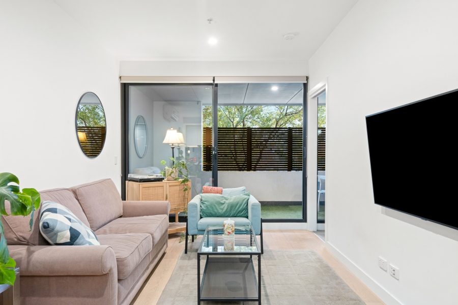 This spacious apartment has a good size kitchen with Smeg appliances, more than ample cupboard space and large island bench. Perfect for those that love to cook! Timber floors throughout the living room provide a lovely modern feel and there is the comfort of carpet in the bedroom. Floor to ceiling mirrored robes offer great storage. The modern bathroom has a large walk in shower and euro laundry. A covered, private balcony offers fabulous space for year round entertaining in all weather. Secure parking and access for 1 car and storage cage. This is one convenient place to call home! Don’t delay.