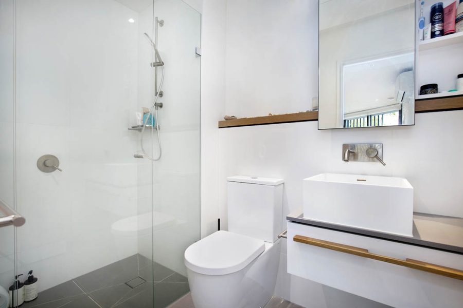 – Purpose built large wooden bench top seamlessly separating kitchen and living space